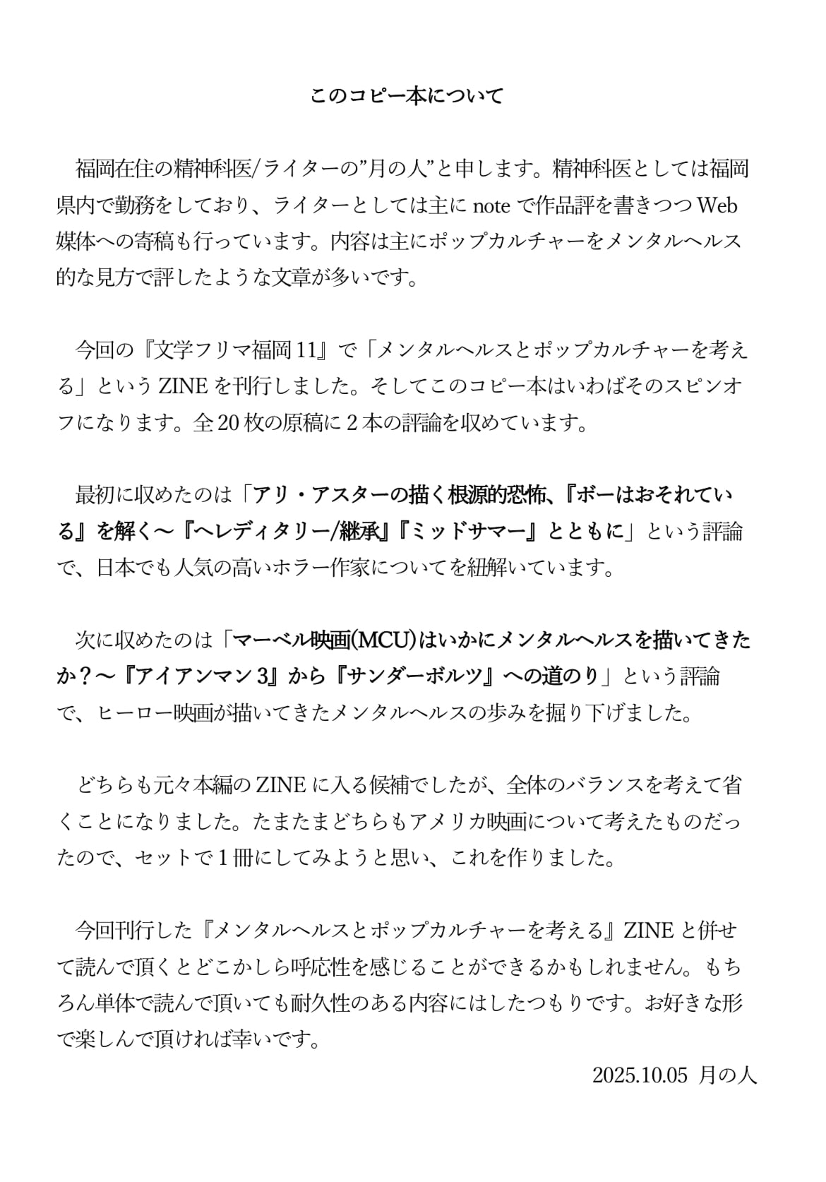 先着の購入特典として、先日の文学フリマ福岡11で同時に頒布した2冊の『月のZINE スピンオフ』のいずれかをおつけします。このページで購入した場合の特典は